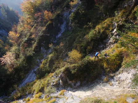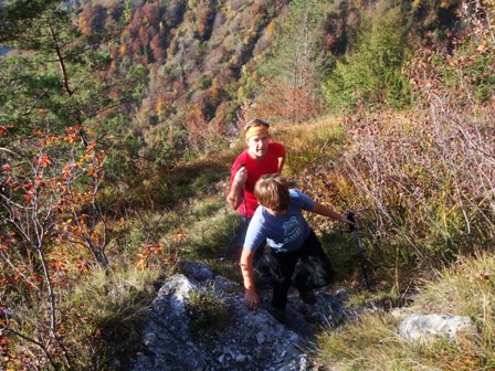 Potem naju je hotela Helena zvabit v popolno strmino, previse, plezarijo, nevarnost, a se nisva pustila! NE, ne greva več naprej! Nazaj pa tudi ne!