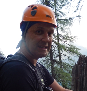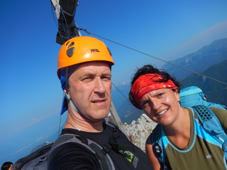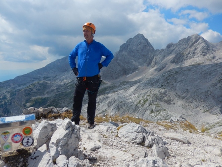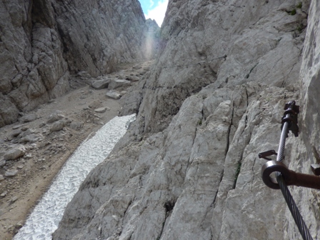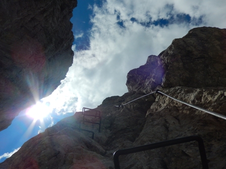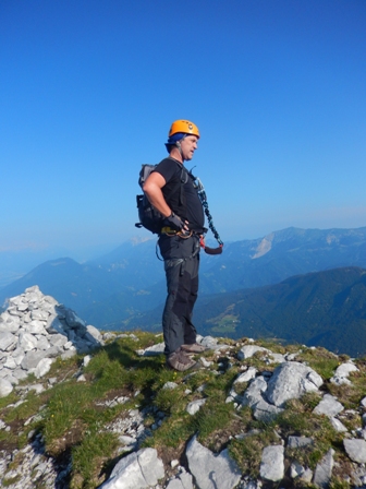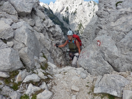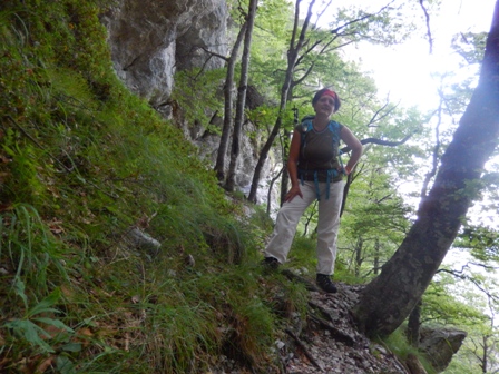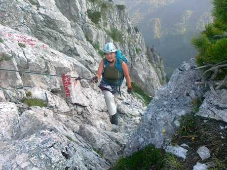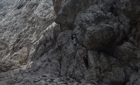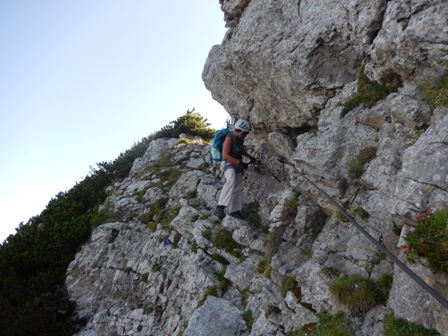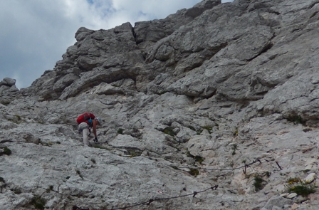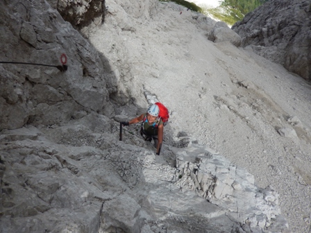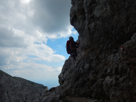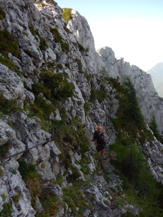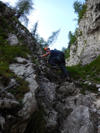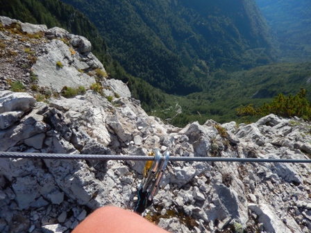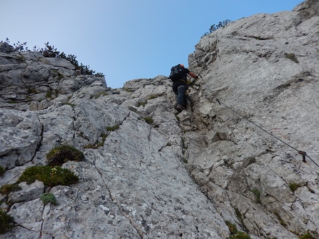 Ta, ta prvi vzpon je pravzaprav najhujši. Vse ostalo je dokaj ok, tale pa je zoprn, sploh s samovarovanjem. Če dobro pomislim, je ravno samovarovanje tisto, kar je tule zoprno. Vse skupaj je namreč malce previsno, držat se moraš na skobah navzven, pripet pa si na navpično zajlo, kjer moraš svoje priponke porivat naprej gor. In ko se hočeš pre-pripet ti kar naenkrat zmanjka rok.