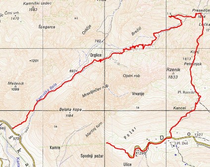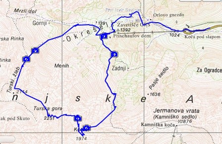 Škoda, da nisva več slikala, a sem bolj pazil na svojo rit kot na to, da bova imela poslikano. Tik pod steno se nato priključiš poti s Kamniškega sedla. Sem mislil, da bom doma na GPSju kaj bolje videl, kje sva šla, a je vse takole: