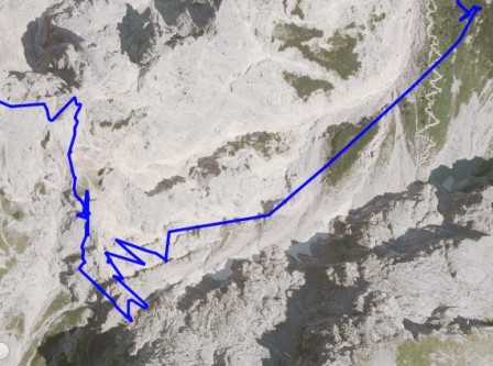 Niti se ne vidi po točno kateri grapi sva šla! Ah, ta natančnost! Se mi zdi, da je pravilna tista spodnja, desna, ne pa leva grapa, po kateri je narisana sled. GPS nima pojma direkt pod steno...