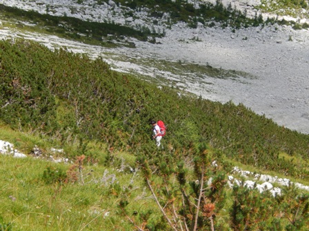 Midva sva sigurno porabila več kot pol ure. Se pa vidi, da je nekaj shojeno in v melišču se še najde shojena pot. Po mojem izkušeni tole naredijo v desetih minutah in kar lepo skrajšajo celo turo. No, razen, če nočeš na čaj na Kamniško sedlo!