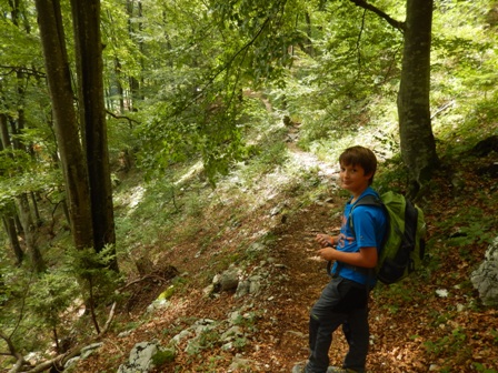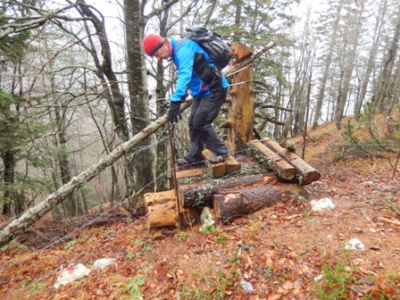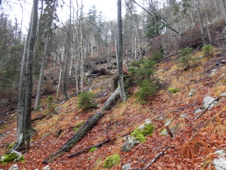 Po razpotju pa sva spet na novem, tu še nisva hodila. Imam nek čuden občutek, da tole ne bo... in res ni. Pot se kar naenkrat izgubi. Zavija preveč v desno, pa podor in...