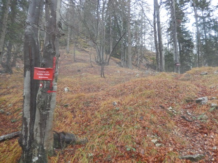 Helena bi jo sicer kar dol mahnila, jaz pa bi raje kako markacijo našel. Malo se pomatrava in na koncu jo le najdeva. Pot gre spet zelo v levo, najbrž je kaj spremenjeno zaradi podora. Slabo opazno. Torej zelo v levo, čez graben, po ozki, ozki potki med strmimi mokrimi travami (kjer začuda ne tulim) potem si pa hitro spet na križišču, kjer sva zavila proti Pl. Koren.