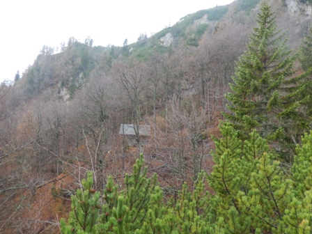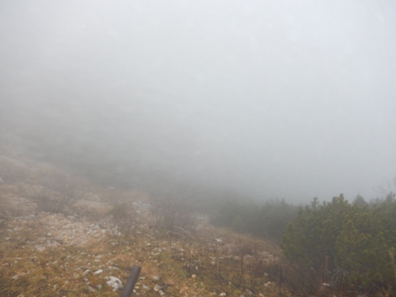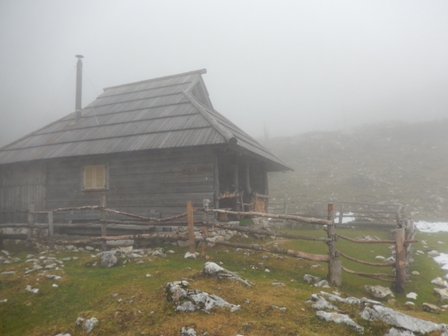 Vreme je vedno bolj super. Spodaj je megla, gor pa oblak. Le vmes se kaj vidi, naprimer lovska koča, ki se jo spomladi seveda mimogrede zgreši.