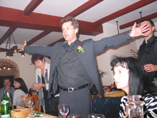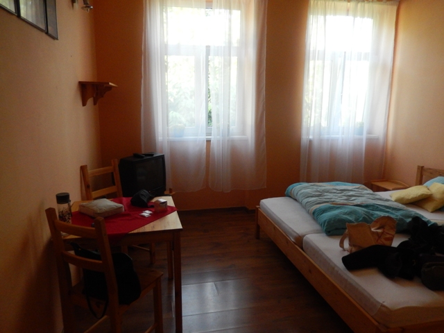 Hotel oziroma penzion je bil prav srčkan, soba kolikor toliko prostorna, lastnik pa... ko sva prišla, je preizkusil vsaj pet ključev, kar pomeni, da je tekal kar naprej gor in dol. Na koncu je bil že tako premočen, da je kar teklo od njega. Angleško ni znal ali pa ni hotel znat, tako da je on govoril v nemščini in češčini, midva pa po naše, češko, angleško, ročno. Kar nama je prišlo pod roko.