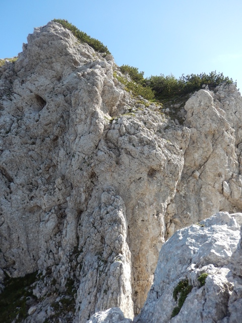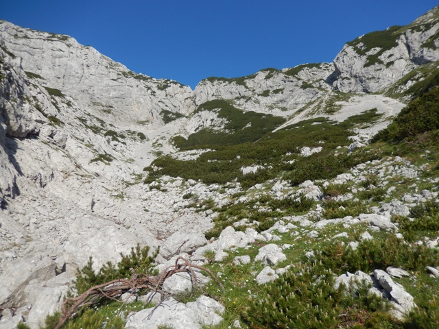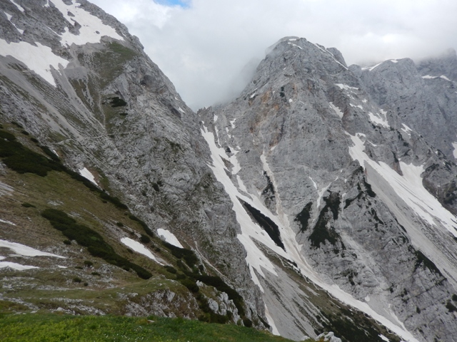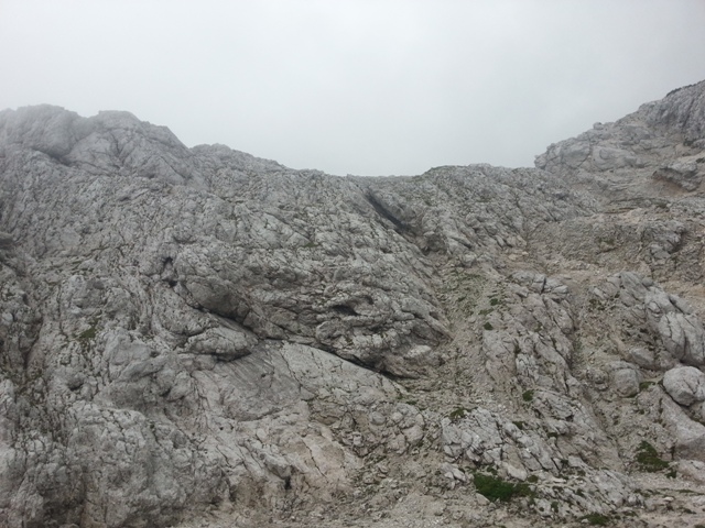 Končno naju vsaj malce hladi in tudi stena proti Cojzovi koči je zaradi tega malce manj sitna kljub vsej svoji razbitosti