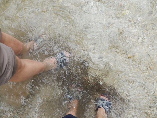 Še obvezen skok v Bistrico, da ti malo žile potegne skupaj in to je to od Kamniškega sedla. Šlapice so postale del obvezne opreme za vsak izlet.