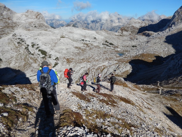 Na žalost ne moremo po dolini Jezer nazaj, splet okoliščin nam nalaga, da gremo po isti poti nazaj, deliti se pa tudi nočemo, prav super se imamo. Pa tudi čas nekako hitro mineva, ob takem lepem vremenu gre hoja bolj počasi, čas pa hitreje teče.