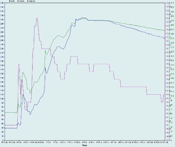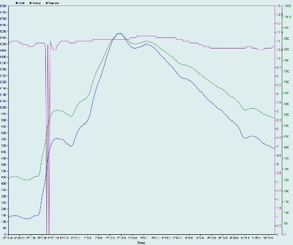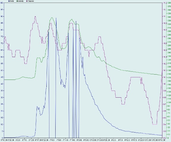 Iška, Iška vas - pretok (modra), vodostaj (zelena) - hiter odziv na padavine:
