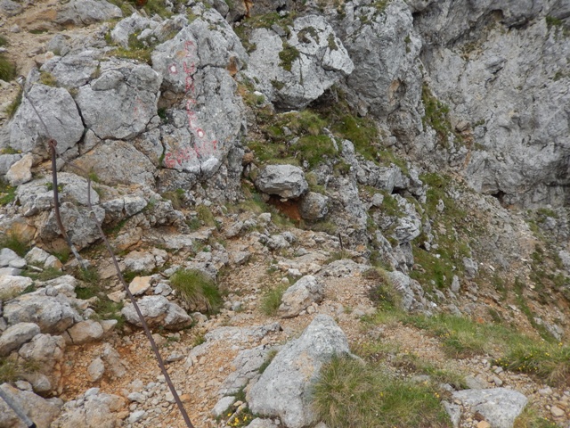 Odcep je lahko najti, najbrž bi ga tudi sam, skala ima na zadnji strani tudi modro znamenje. Pa tudi v nadaljevanju potke ni težko najti. Ni sicer zelo jasna, se pa čez napol melišča kar dobro vidi.
