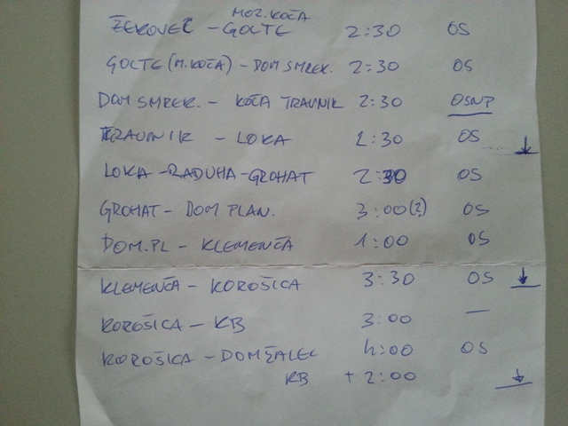 K sreči je na poti polno planinskih koč, treba je bilo zbrat in pregledat časovnice, nekje malo prilagodit, nekje malo špekulirat. Najtežje pri vsem je, da vnaprej nimam prav nobenega pojma, kako nama bo šlo. Bova hitra? Počasna? Se nama bo dalo ali se bova vlekla? Nič ni določenega. Kje bova torej spala, do kam bova sploh prišla? Glede na junijski čas se vsaj ni bilo bati prevelike zasedenosti, gneče, rezervacije niso potrebne. Tako sva si sestavila en takle listek, plan z vsemi potrebnimi podatki: