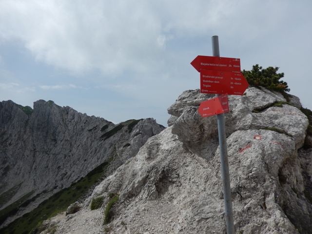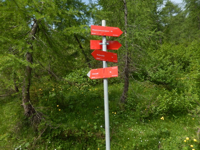 V sestopu smo po robu planote mimo nesrečnega okna prišli do odcepa poti za Rigelj.