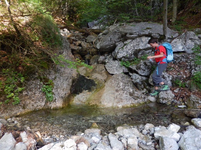 Pot je lepa, a strma. Vmes pa je polno nekih stvari, ki te motijo in ne moreš prav hitro hodit. Naprimer tolmunčki, ki se jih trudiš spit do konca. Še vedno je namreč vroče ko pri norcih, od nas le teče in škropi...