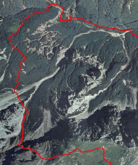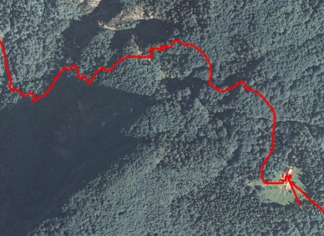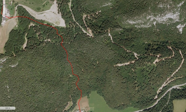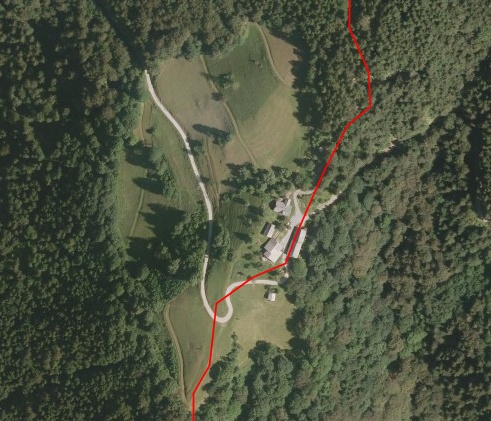 No, sem jo vsaj doma potem našel. Na karti, ortofoto. Res je tam, samo tam zgoraj ne bi smela zavit, pa bi bilo. A kdo je vedel, kaj?! Prišla bi par sto metrov nižje in brez težav, brez hudih strmin.
