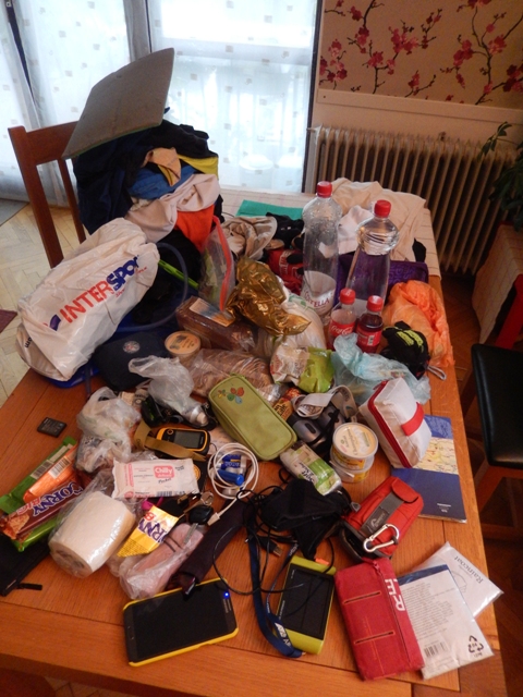 Ker sva bila kar malo jezna na težke nahrbtnike, sva vse, čisto vse, kar sva imela, zložila na mizo in nastal je velik kup.