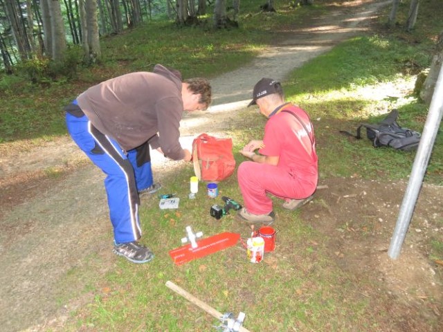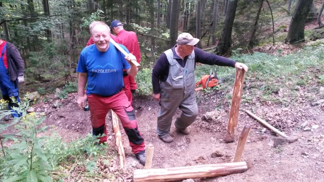 Povsem nepričakovano je tam nekje sredi dela na nas naletel tudi gorski kolesar! Kaj hujšega - markacisti ravno v delu na poti, z vsem orodjem v rokah, mimo njih pa gorski kolesar! Zaprepadenost obeh strani je bila velika in fant je v hipu premeteno pogruntal, da je zapeljal pravzaprav direktno v sršenje gnezdo. Kolo pod miško in še preden smo se lahko obrnili, je že skakal po stopnicah navzdol.