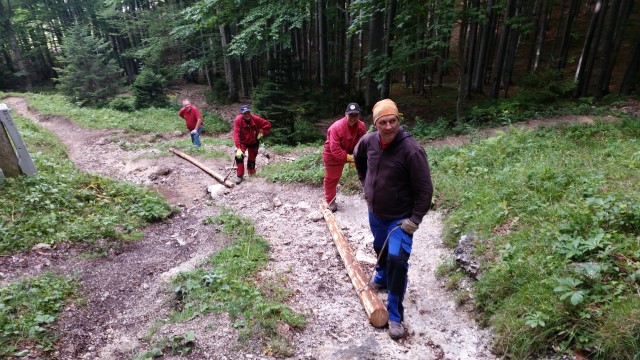 Takole se tovori debla po trasi navzgor. Precej naporno, predvsem pa počasi. Še danes nimam pojma, kako nam je sploh uspelo kaj takega pritovorit gor.