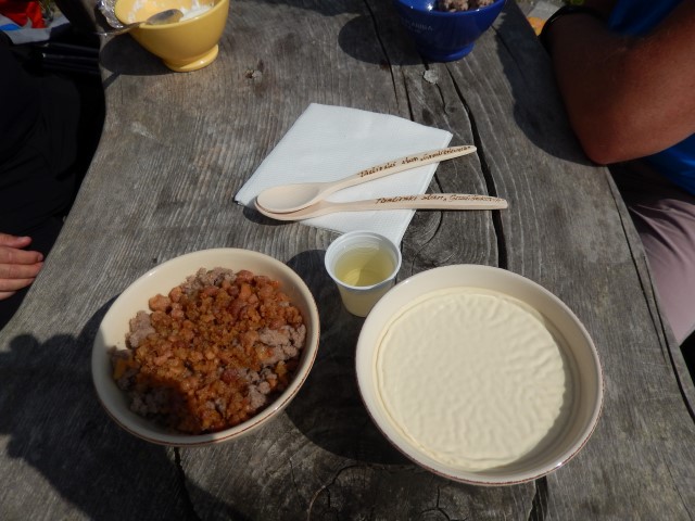 A vseeno ni bilo tako enostavno. Vmes so se namreč postavili Gradišekovi in nas malce premotili in čeprav ni bilo nobenega prostora, smo le dočakali naše žgance in kislo mleko. In encijan seveda.