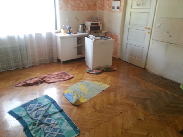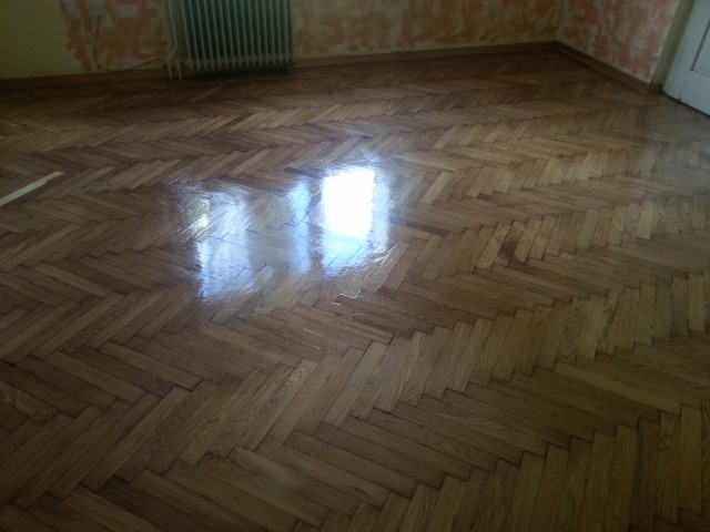 Pa parket nam je sosed malo zbrusil in parkrat prelakiral. Itak se je ves lak sproti zgubljal, delavec pa je kar norel, ko je naslednji dan prišel in laka nikjer... vse gre v špranje. Popravljat ga pa nismo hoteli, nima smisla. To je stara bajta, naj bo tudi parket star.