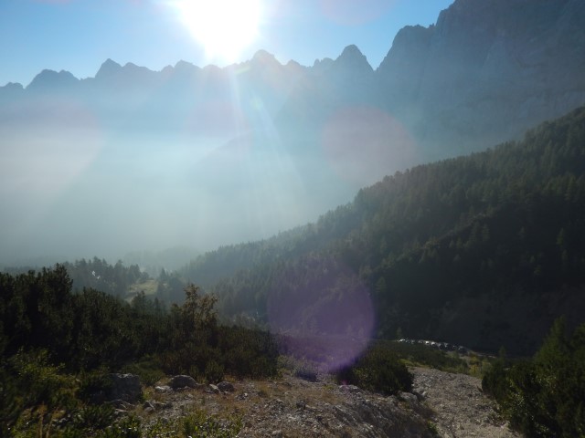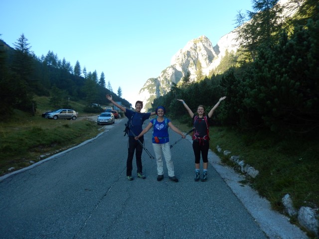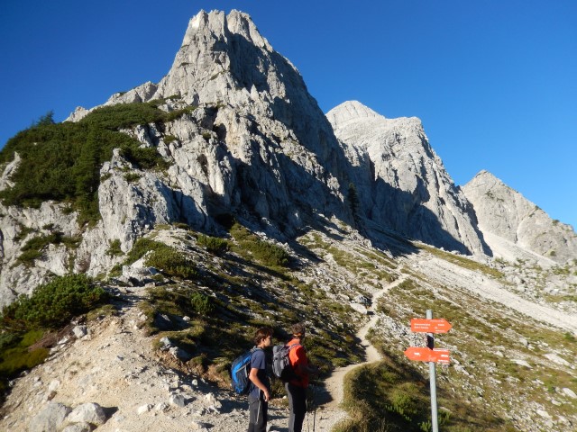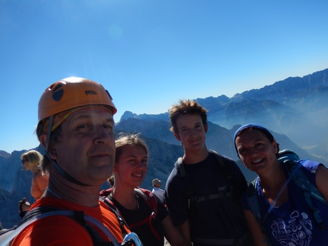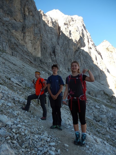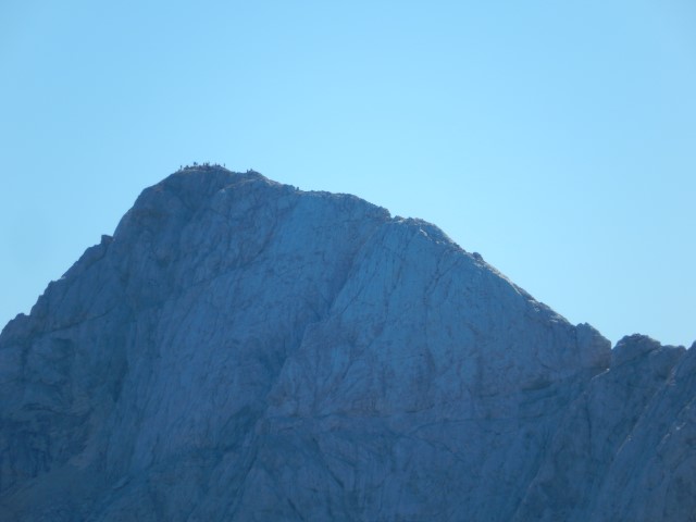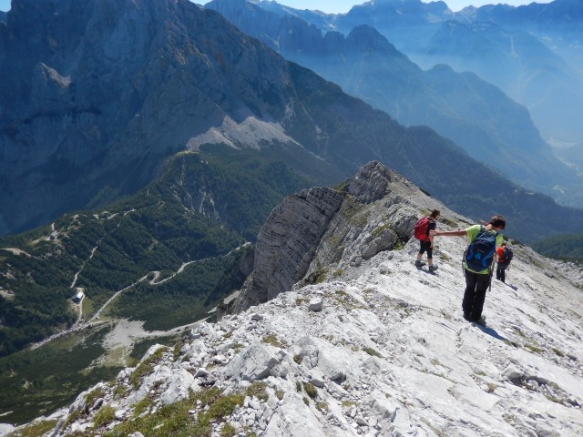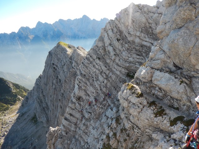 No, nekateri pa itak... kakor smo v Stolu zadnjič videli, da se avstrijci znajo zavarovat in da jim ni težko opreme s seboj vlačit, je bila tule drugačna slika. Bližina Vršiča pač naredi svoje in na poti najdeš neverjetno veliko pogumnežev, ki opravijo s potjo z levo roko in desno nogo. Brez samovaroval in brez čelade. V gručah po tri do pet, večinoma družine. Spredaj šef, ki zna v hribe hodit, zadaj pa - malo starejši - otroci. Da jim pokaže, kako se to dela. In ne nekaj počasi, zanesljivo, če se le da hitro, čim hitreje!