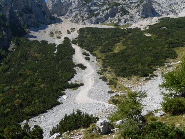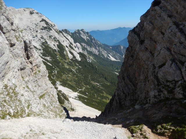 Ajejej, kakšen kiks. Ko bi moral zavit skozi majhen prehod tamle gor na desni, sem pametno zavil levo in se znašel v ozkem jeziku. No, ruševje nam je dalo še malce veselja in smole, melišča pa je k sreči še nekaj ostalo.