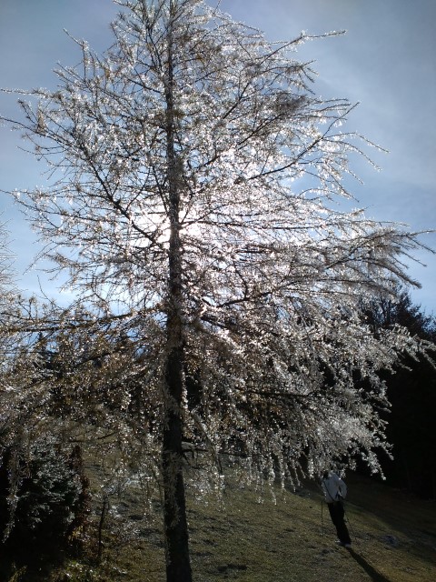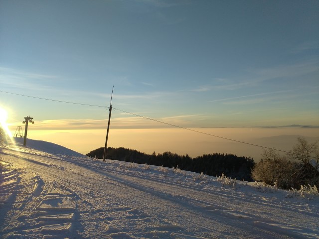 Potem pa se odpravimo, z našega konca je kar nekaj vožnje do Cerkelj in naprej proti Ambrožu. Iz doline se tudi ni veliko videlo, megla je bila kar gosta. Ko pa smo prišli malce višje... je vse okoli nas vedno bolj postajalo belo. Prosim? Kaj? Kako? Krvavec ves zelen, okoli nas pa vedno bolj belo. A to je tako hudo ivje al kaj?