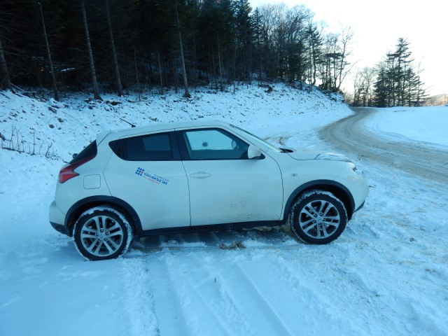 Tako človeka kaj piči in sam niti ne ve, kako in zakaj. Tokrat me je pičila trma in ne bo mene tale sneg! Ne pa ne! In sem obrnil in zapeljal kar naprej, proti vrhu! Ni bilo najlažje, od začetka je vse vrtelo, spodrsavalo, dokler nismo dobili začetne hitrosti, je šlo po celi cesti sem in tja. Pa se nisem dal, mali francoski japonec pa tudi ne. K sreči so bile vsaj gume zimske, z letnimi bi najbrž pod breg zapeljal že kak kilometer nižje.