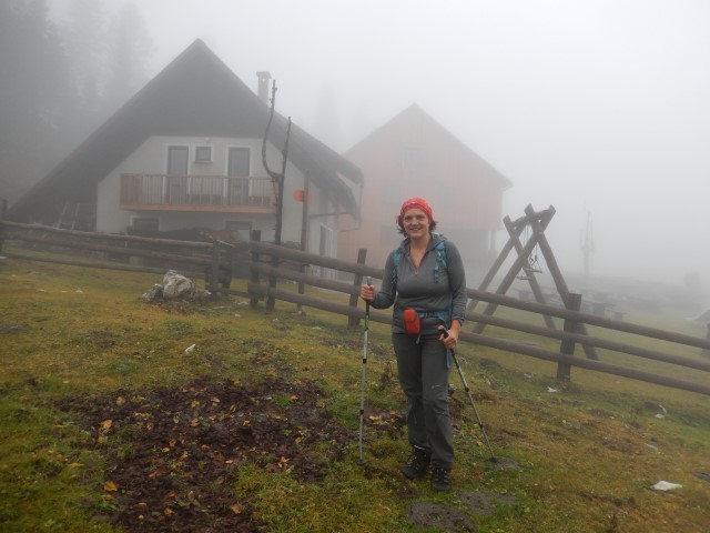 Koča je k sreči odprta, da se vsaj malo pogrejeva. Pot dobro poznava, v tej megli bi lahko še zgrešila...