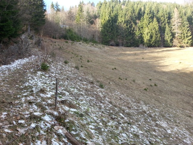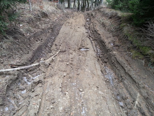 Navzdol jo potem mahnem spet po markirani poti čez Vrata proti Klemenčevem. K sreči je bilo vse blato, ki ga je v teh časih vlačenja lesa iz gozdov na tone, fino pomrznjeno. Juhu!