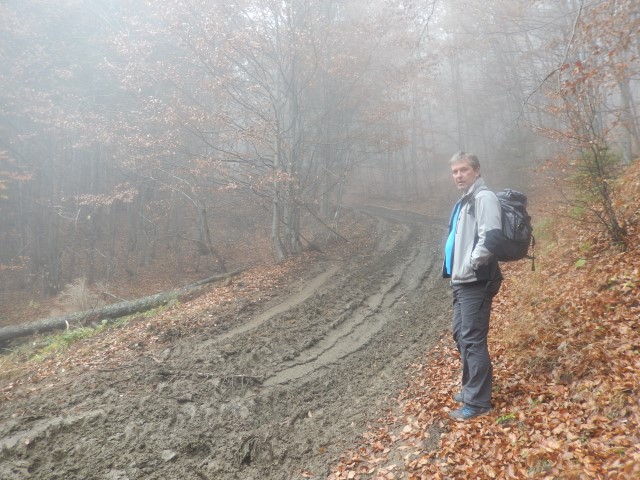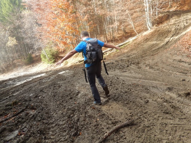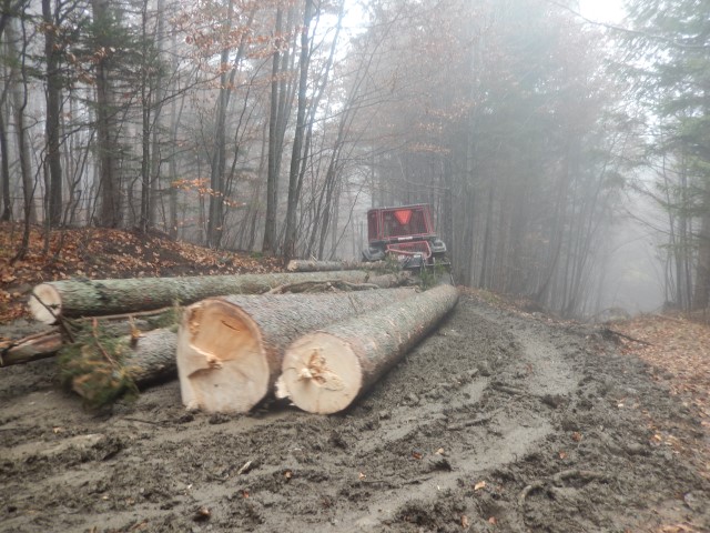 Odvažal je vse, kar je mojster malo višje nažagal. Žago sva seveda slišala, on pa naju ni, zato sva bila bolj previdna, pot sva v tisti količini blata že povsem izgubila, do gozdarja sva se pa prebila kar povprek, tako da sva do njega prišla v varnem kotu in ob pravem času - ko ni več žagal. Kakšno smo rekli, nekaj o zapuščenih poteh in o tem, da bo počakal par minut, preden bo spet kaj podrl.