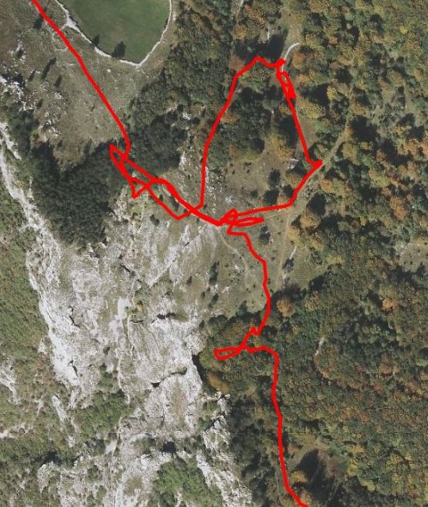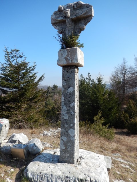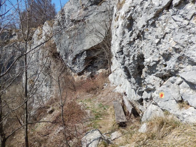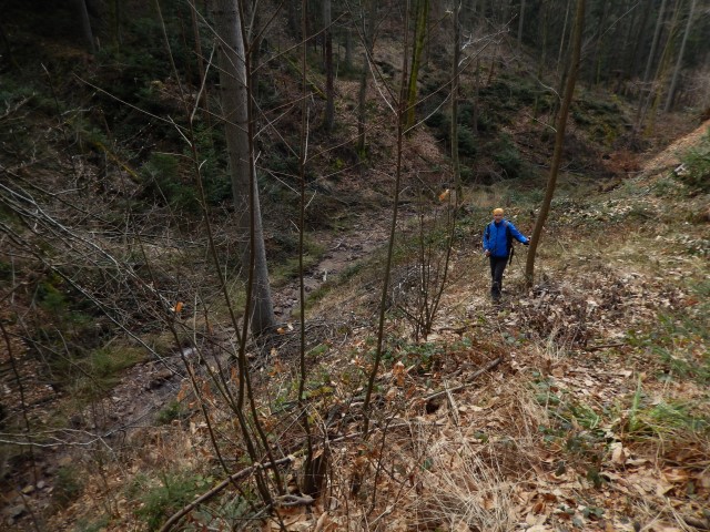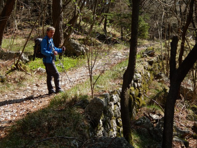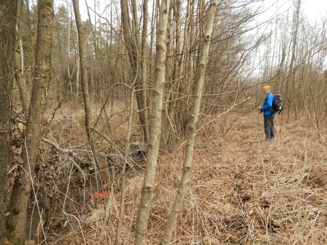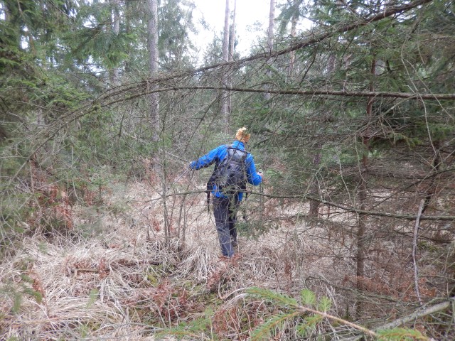 Nazaj jo tokrat ne ubereva po spodnji cesti, ampak jo mahneva spet kar lepo po grebenu. V začetku skušava mimo jevniške skrivnosti najti še staro pot, kar nama tudi uspe, vendar pa je že kar precej zaraščena. Tale ne bo več uporabna, aprila tule čez sploh ne bi več prišel...