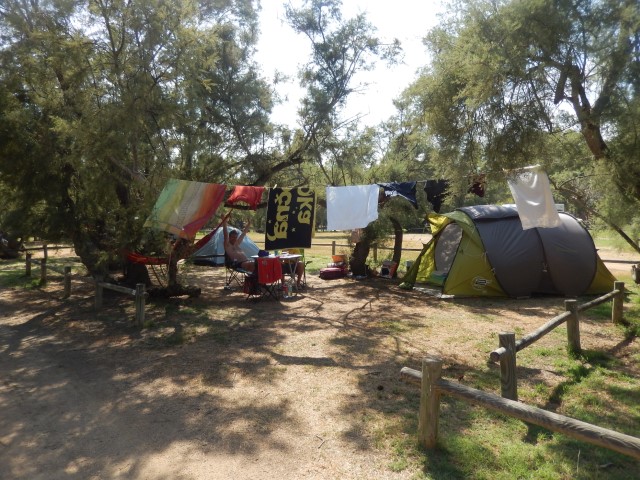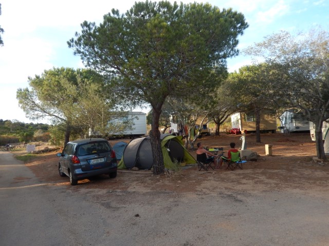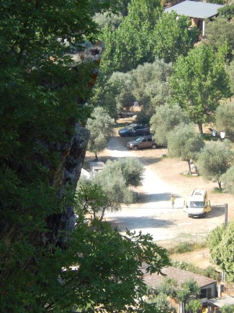 Lahko pa pogledaš tudi v kamp, če je avto še tam - se ga skoraj ne vidi, čisto tam na koncu, med oljkami je naša Toyota. Takrat še nismo vedeli, a ker je bil avto narobe obrnjen - parkirati *moraš* vzvratno! - nas je lastnica nakurila ko zajce, ko smo prišli nazaj... Malo je manjkalo, da nas ni direkt vrgla iz kampa. Narobe smo parkirali!!! Ja, še dolgo smo potem razmišljali zakaj in ker obrazložitve ni bilo, nam ni nič drugega padlo na pamet, kot to, da je to najbrž zaradi kakih požarnih zadev. Heh, za našo varnost torej?! Dobro nas je nakurila!