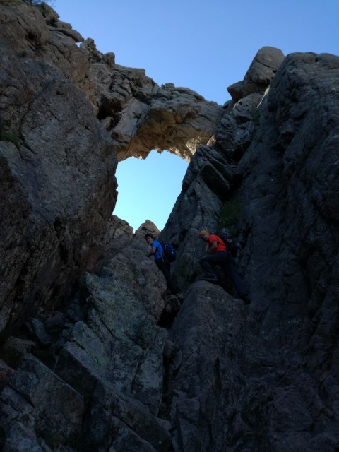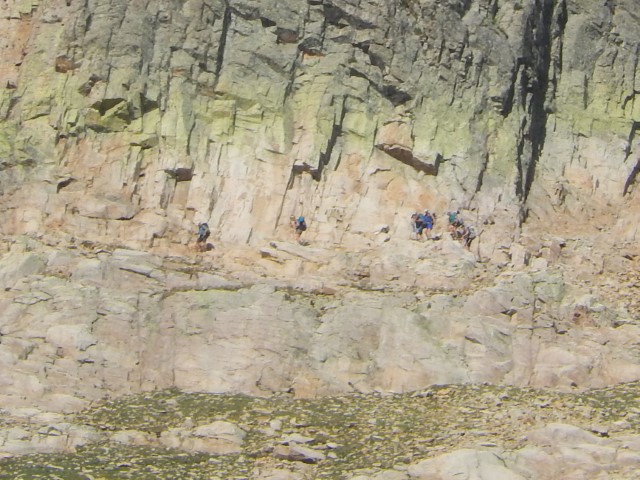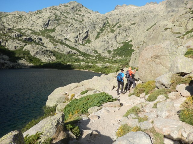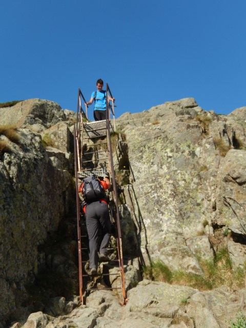 Proti spodnjem jezeru vodita dve poti, ena gre bolj okrog in smo jo prišparali za spust, druga pa je bolj direktna in se vzpne čez granit tudi z lestvami in podobnim železjem. Nič hudega, primerno za vse, a zanimivo.