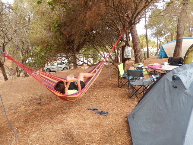 Kampirat smo odšli v Kamp Sud, ki ni bil prav blizu, a tudi prav daleč ne. Pod Ajacciom je polno nekih plaž in kampov, smo motovilili kar parkrat gor in dol, preden smo se odločili za tega. 28,5 €/dan.