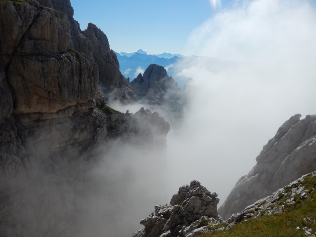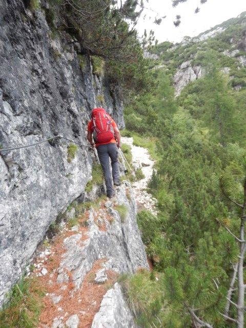Okolica je bila fascinantna, sredi stene si, res veličastno, pot niti ni tako grozna, sem in tja ti sicer kak del telesa visi v globino, a, hej, bo že nekako! Pa vseeno ti počasi kljuva zadaj v glavi, počasi sva oba vedno bolj nervozna.