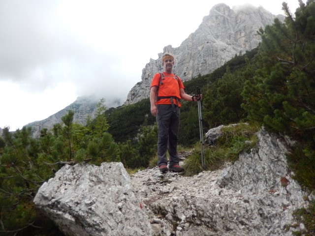 Če pogledam nazaj, je pravzaprav že ta ta prvi vstop precej zoprna zadeva, vendar ga skoraj ne opaziš, ker si šele povsem na začetku. Po tisti prečni polički se je treba prebit malo višje brez kakšnega varovala. No, nič hujšega, a zdaj, ko pogledam nazaj, je bilo že tisto kar precej za naju.