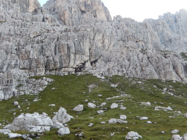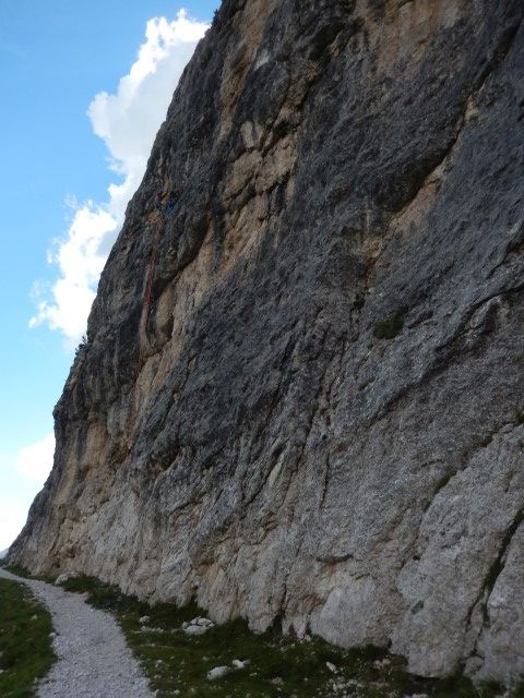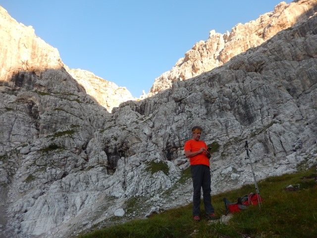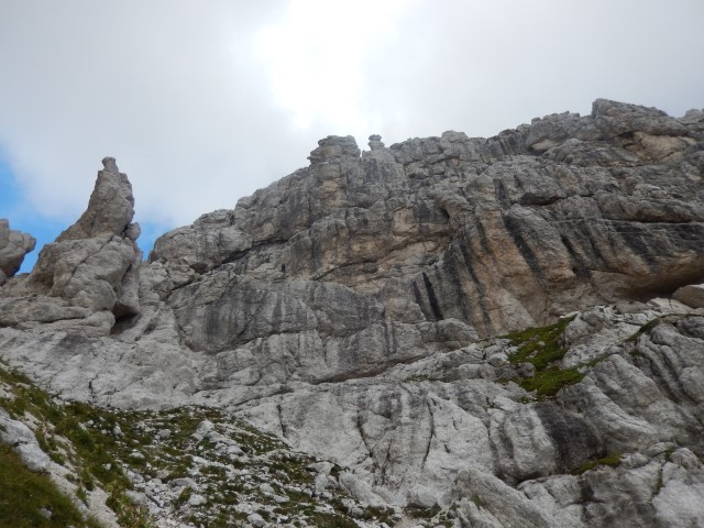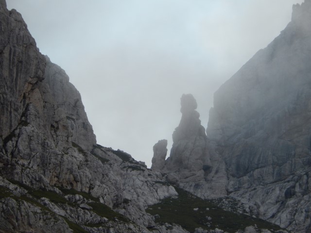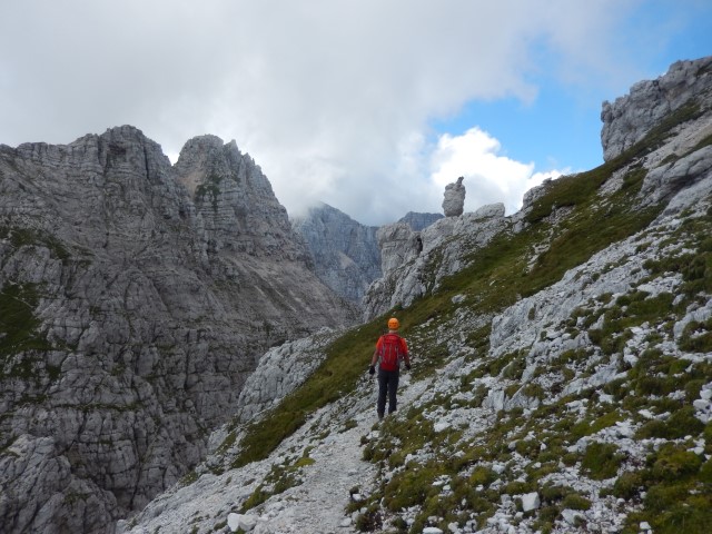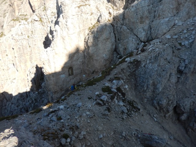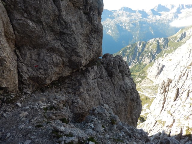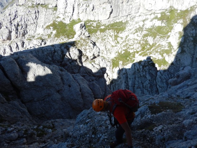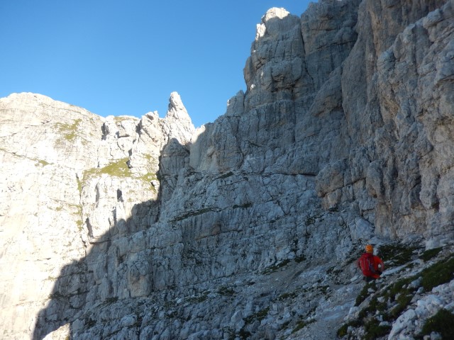 Takole zgleda od spodaj, tamle vmes je črna pika, pohodnik za nama. Nek sistem malih poličk in poči, a je vse kar precej izpostavljeno. Mnogo preveč za moj okus. Pa gor bi najbrž še nekako šlo, dol pa... huh. Pa mogoče bi tudi to še šlo, če ne bi bilo vsega tistega za nama. Tako pa kakšnega potrpljenja ni bilo več, vsi strahovi od celega dne so se nabrali v isto točki, vsa nervoza je dobila krila. In potem vse postane presneto težko in tudi mesta, s katerimi bi v normalnih razmerah opravil z levo roko, dobijo statust nemogočega.
