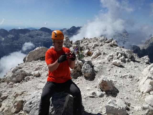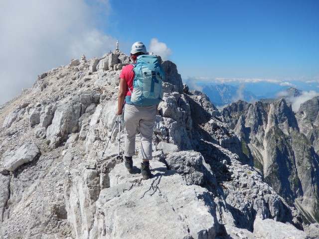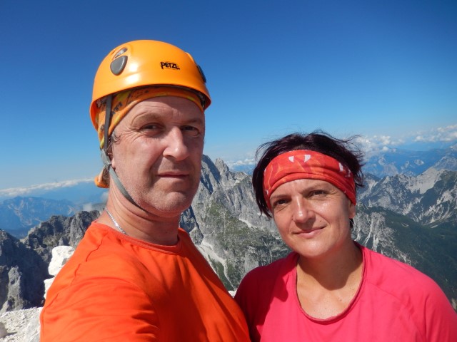 Ampak to še ni vse. Je treba še dol prit. In če že sva toliko pogumna, pa bodiva pogumna še naprej in pejva še naprej po Aniti Goitan. Ker se nekdo ni najbolje pripravil in ni najbolje vedel, kaj to sploh pomeni. Nervoza se je delala, da je minila, na vrhu sva bila, saj hujše pa res ne more bit več, no! Pa sva šla proti Mojzesovi škrbini.