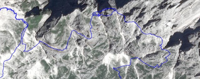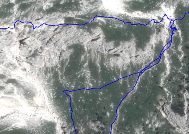 No, spodaj pod kamini sem zavil na severno stran špice, povsod piše POZOR LED, ker je v snegu obvoz še mnogo bolj nevaren, a k sreči ga v tej zimi res ni bilo. Je pa precej zoprno melišče nad kar presneto visoko steno, a je jaz tokrat sploh nisem opazil, prečil sem tisto melišče in na drugi strani špice res prišel v škrbino, čez katero sva prej lezla in kjer nisem opazil odcepa. Če bi bil bolj pozoren oz. če bi bil pripravljen na odcep, bi ga videl in bi bilo vse drugače. Pa ga nisem.