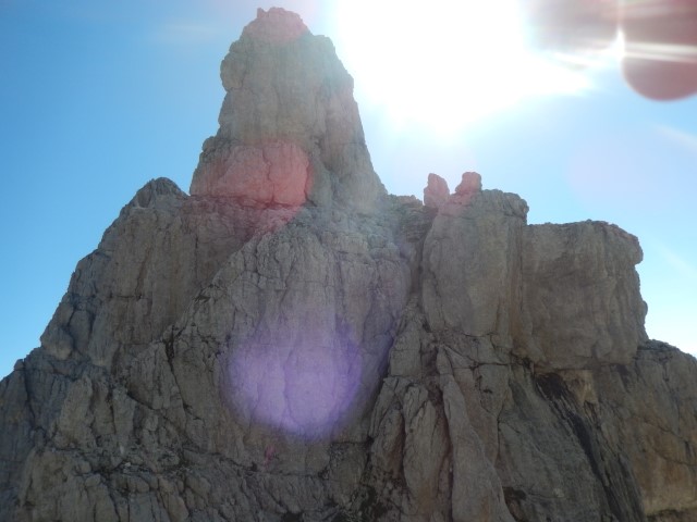 Evo je, Innominata (Neimenovana, kar je spet mnogo bolje kot Mala špica (ah!!)) špica, ki jo imam za vedno zapisano v glavi. Mater! Desno od sredine se vidi sistem kaminov, ki jih je treba preplezat navzdol.
