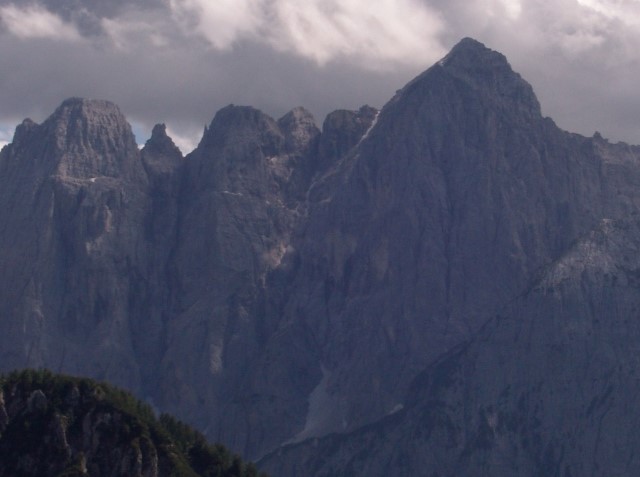 Na sliki je Innominata s severa, tista mala špička vmes. Od škrbine na levi čez vrh in kamine dol v desno škrbino ali pa po obvozu - ki pa tule res tudi zgleda grozno izpostavljeno - spodaj. Če je tamle gor sneg, je to prava skakalnica direkt v dolino. Kaj je bilo meni, da sem šel celo dvakrat tam čez, pri tem pa mi vse skupaj sploh ni zdelo grozno in se sploh nisem sekiral, mi še danes ni povsem jasno. Ali pa to pomeni, da so bili kamini RES tako presneto težki zame?