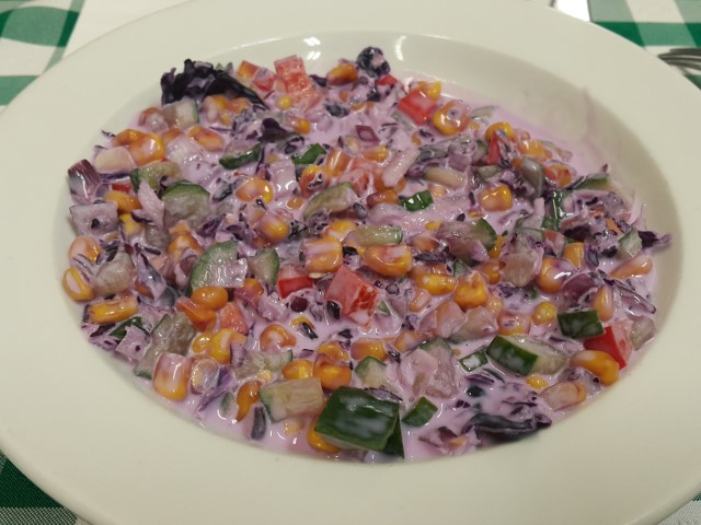 Kuharice se sicer trudijo, a z mojim vegetarijanstvom imajo vedno težave. Tokrat sem pa dobil nekaj novega. Res sem nekaj časa pomišljal, ampak sem vseeno vse pojedel. In bilo je čisto ok, neverjetno, ne bi sodil po vseh teh barvah.