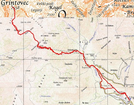 Na Korošico smo se zapodili s Planine Podvežak, nekako še najbližje. Polni rukzaki, oprema, hrana, vsega boga.