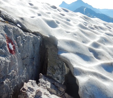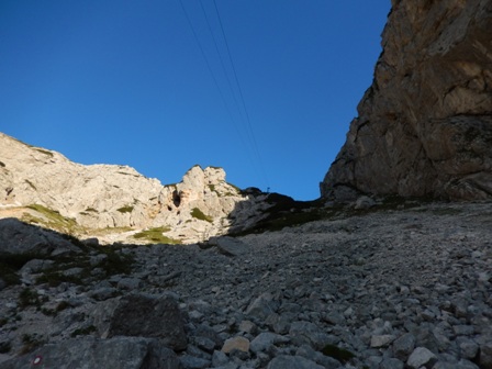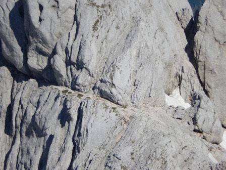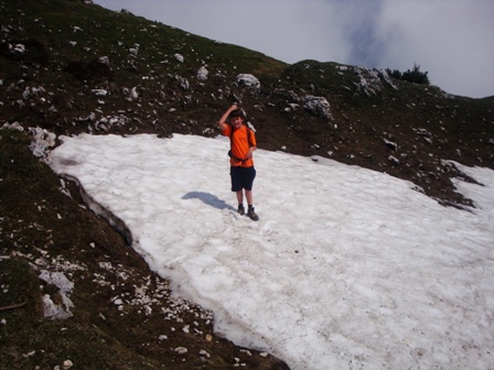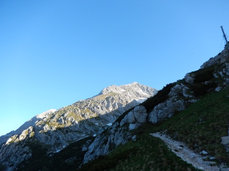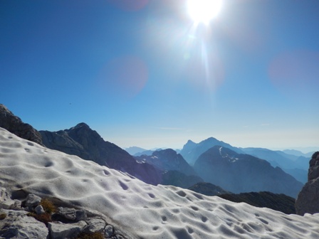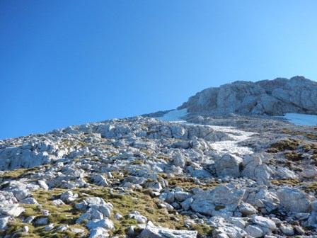 Na strehi se prikaže prvi sneg, a ga sploh ni veliko in se mu da izognit. Nato vidim v daljavi trop živali (niti ne vidim ali so kozorogi ali gamsi) pa se mi skrije za greben še preden mi uspe fotografirat. Škoda, pa tako zgoden sem in še prvi! Sonce pa že visoko na nebu in žge. Žge. Tudi na tej višini!