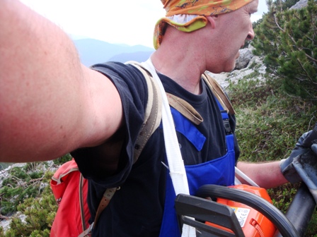 Razporedili smo se v dvojke, en žaga z motorko, drugi odmetava požagano ruševje.