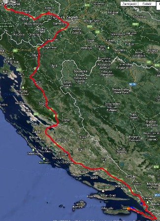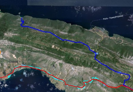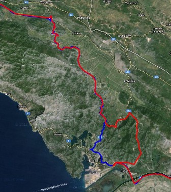 Do konca avtoceste tam nekje bogu za hrbtom, seveda. Potem se pa cjaziš vsaj tja do Ploč. Modra dol grede, rdeča nazaj grede. Zakaj tako? Pojma nimam, jaz sem samo znakom sledil...